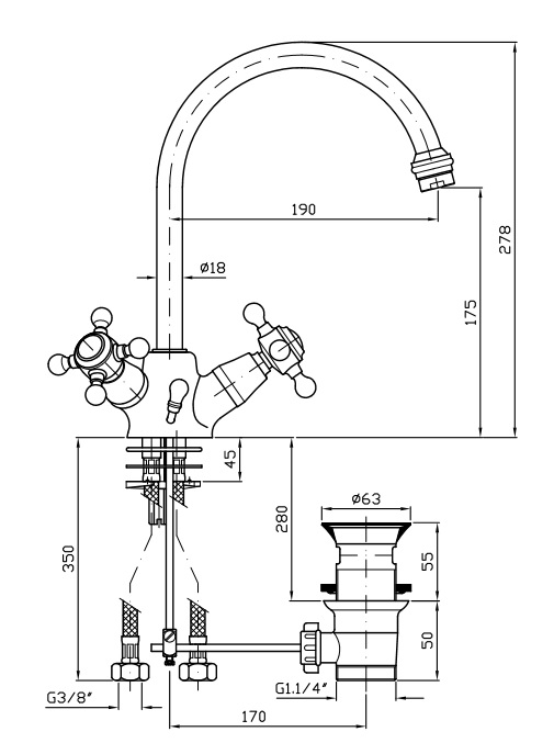 1-otworowa bateria umywalkowa, wylewka stała z perlatorem, korek 1 ¼”, wężyki elastyczne.