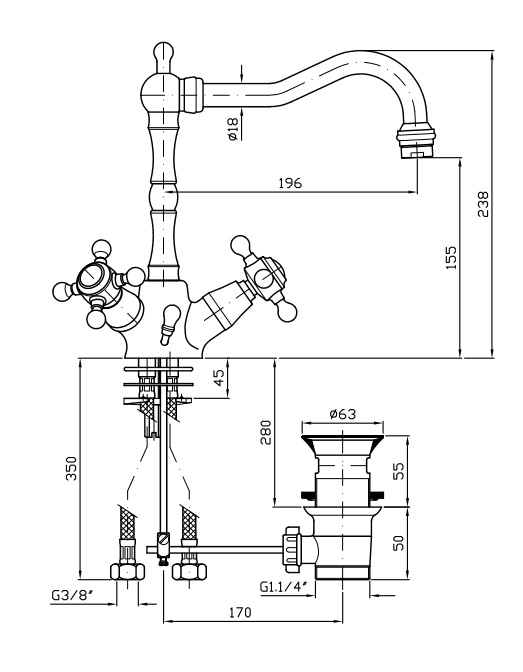 1-otworowa bateria umywalkowa, wylewka stała z perlatorem, korek 1 ¼”, wężyki elastyczne.