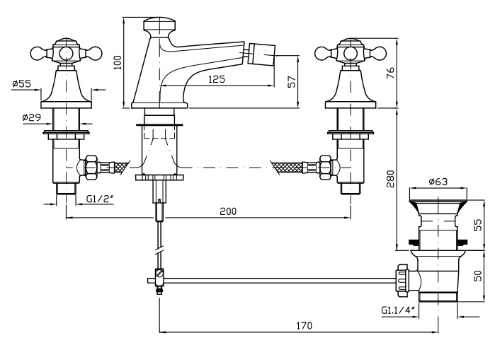 3-otworowa bateria bidetowa z perlatorem, korek 1 ¼”, wężyki elastyczne.
