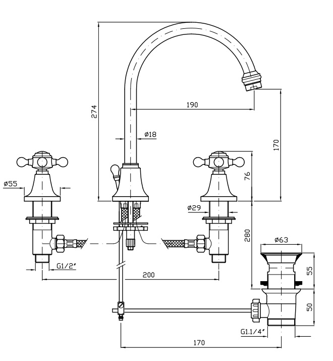 3-otworowa bateria umywalkowa, wylewka satała, z perlatorem, korek 1 ¼”, wężyki elastyczne.