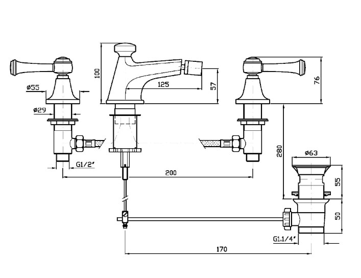 3-otworowa bateria umywalkowa z perlatorem, korek 1 ¼, wężyki elastyczne.