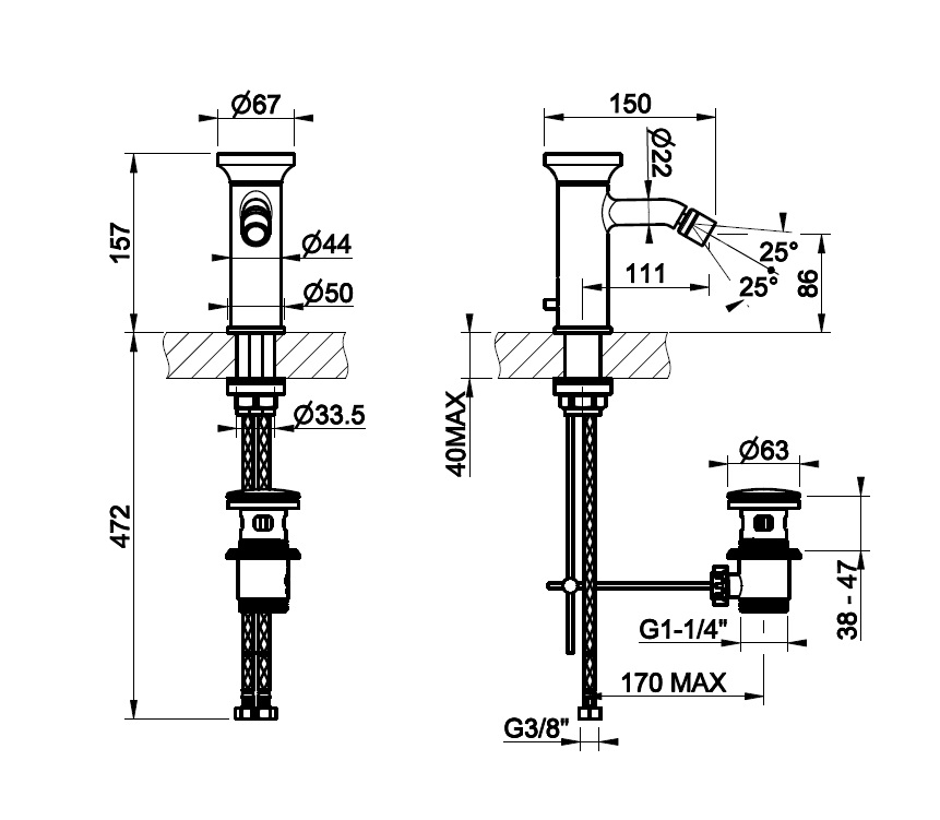 Gessi Origini Bateria bidetowa jednootworowa z korkiem warm bronze brushed pvd 66007.726